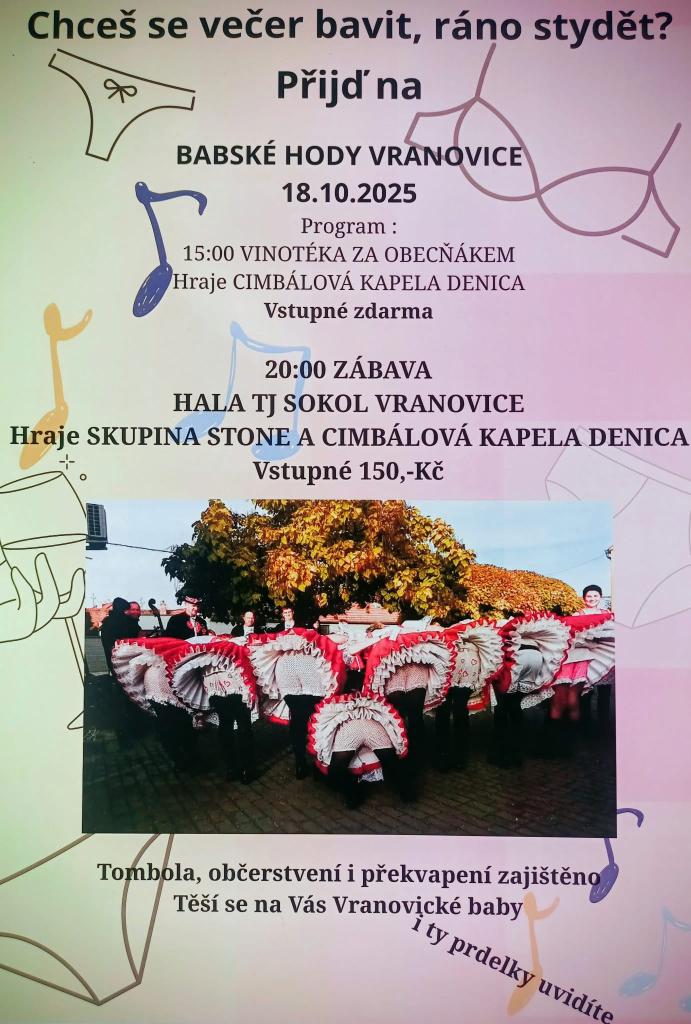 A je to tady.... opět se nám blíží Babské hody a my vranovické baby vás všechny srdečně zveme v sobotu 18.10.2025 Během dopoledne budeme osobně zvát se sklenkou vína a úsměvem. Od 15 hodin se na vás budeme těšit na Vinotéce za obecňákem i s cimbálovou kapelou DENICA. No a pak večer? no to musíte přijít, večerní zábava od 20 hodin v hale TJ Sokol. K poslechu a tanci nám zahraje naše nejvíc oblíbená skupina STONE