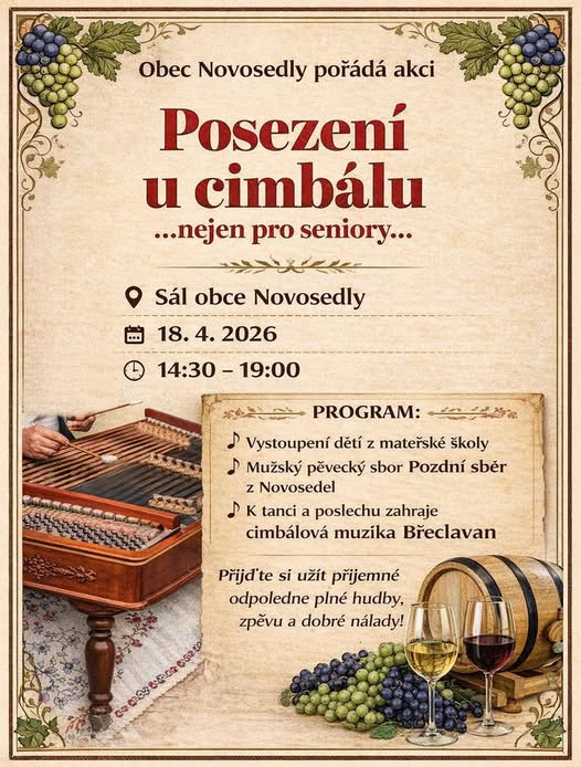 Obec Novosedly srdečně zve na akci Posezení u cimbálu, která se koná 18. dubna 2026 od 14:30 do 19:00. Program zahrnuje vystoupení mladých lidí z mateřské školy a mužského pěveckého sboru Pozdní sběr z Novosedel. K tanci a poslechu zahraje cimbálová muzika Břeclavan. Přijďte si užít příjemné odpoledne plné hudby, zpěvu a dobré nálady.