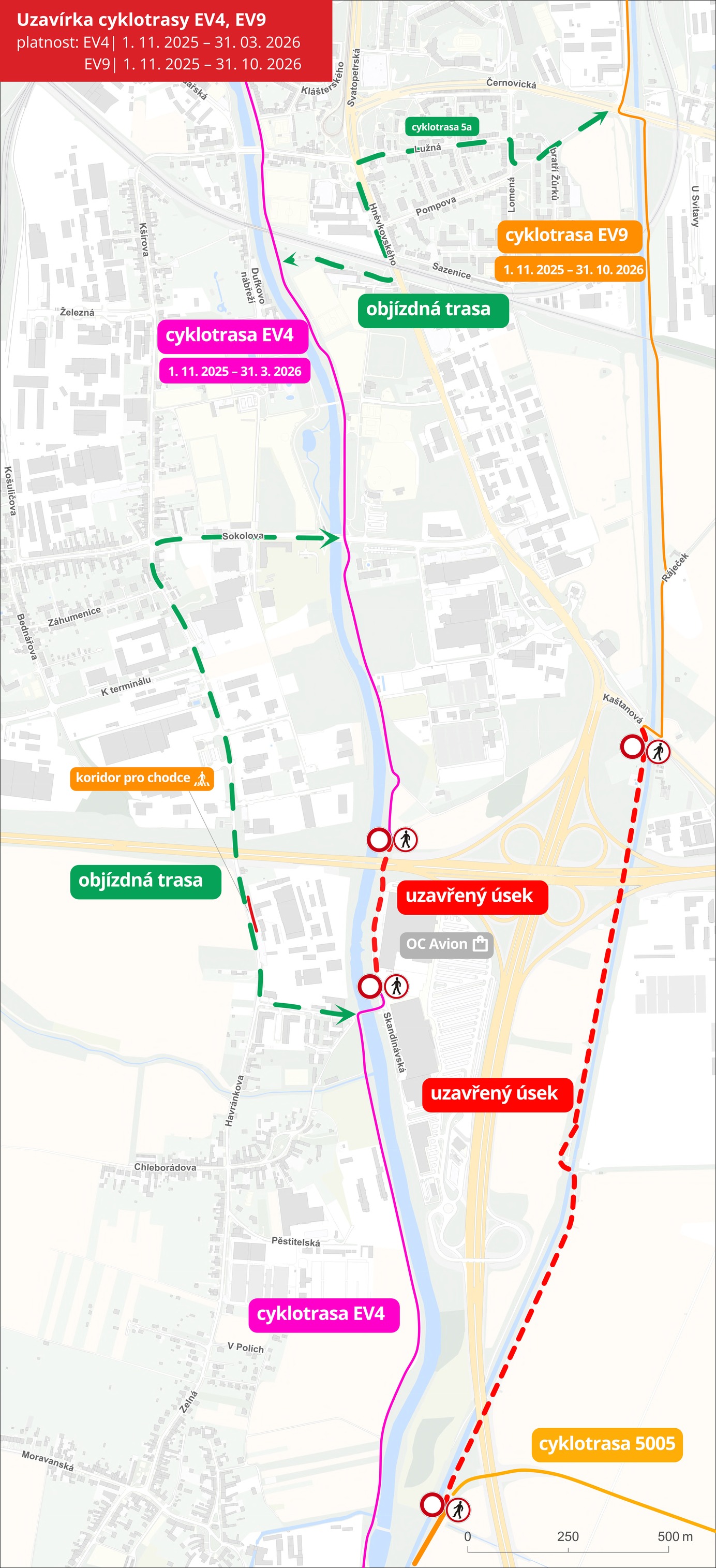 Jistě již mnozí z Vás zaregistrovali informaci o uzavírkách cyklostezek poblíž stavby křížení D1 a D2, kterou minulý týden ohlásila brněnská městská část Brno - Jih. Město Brno připravilo přehlednou mapu s vyznačenými objízdnými trasami, kterou rádi sdílíme a šíříme dál. Situace je to nelehká a doufáme, že se podaří zprůjezdnit hlavní trasu Brno - Vídeň dříve než na konci března 2026.